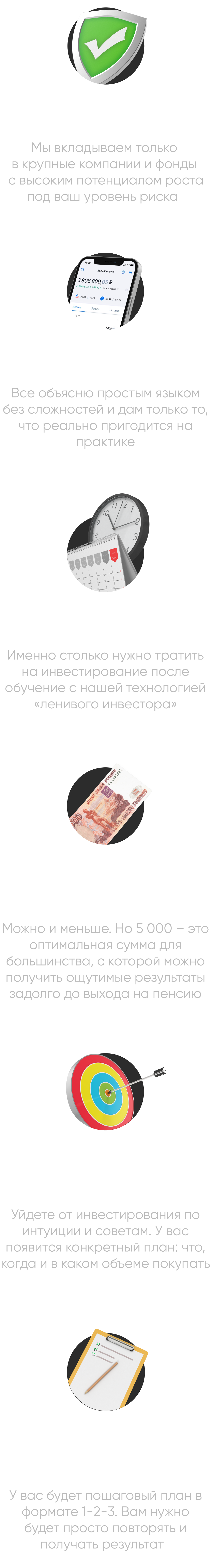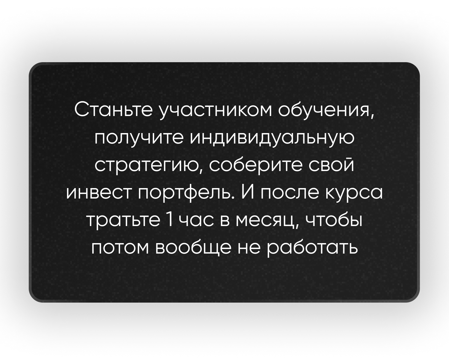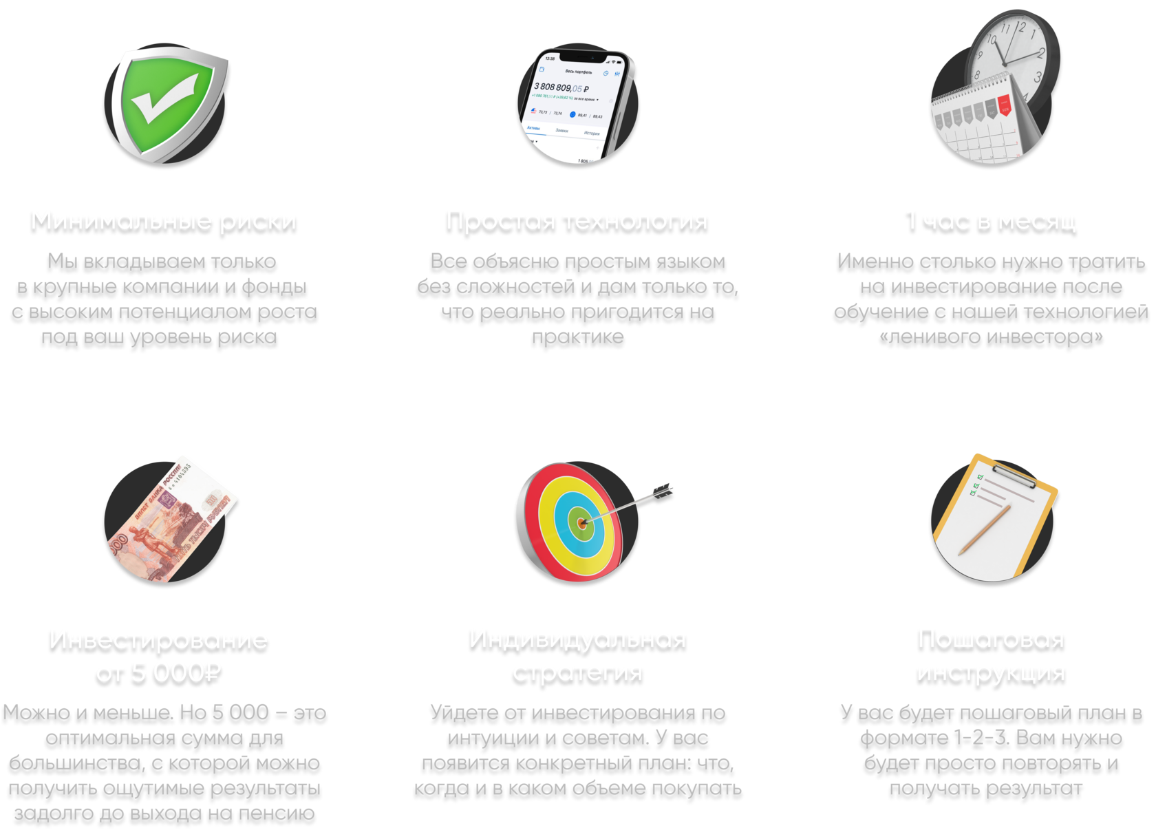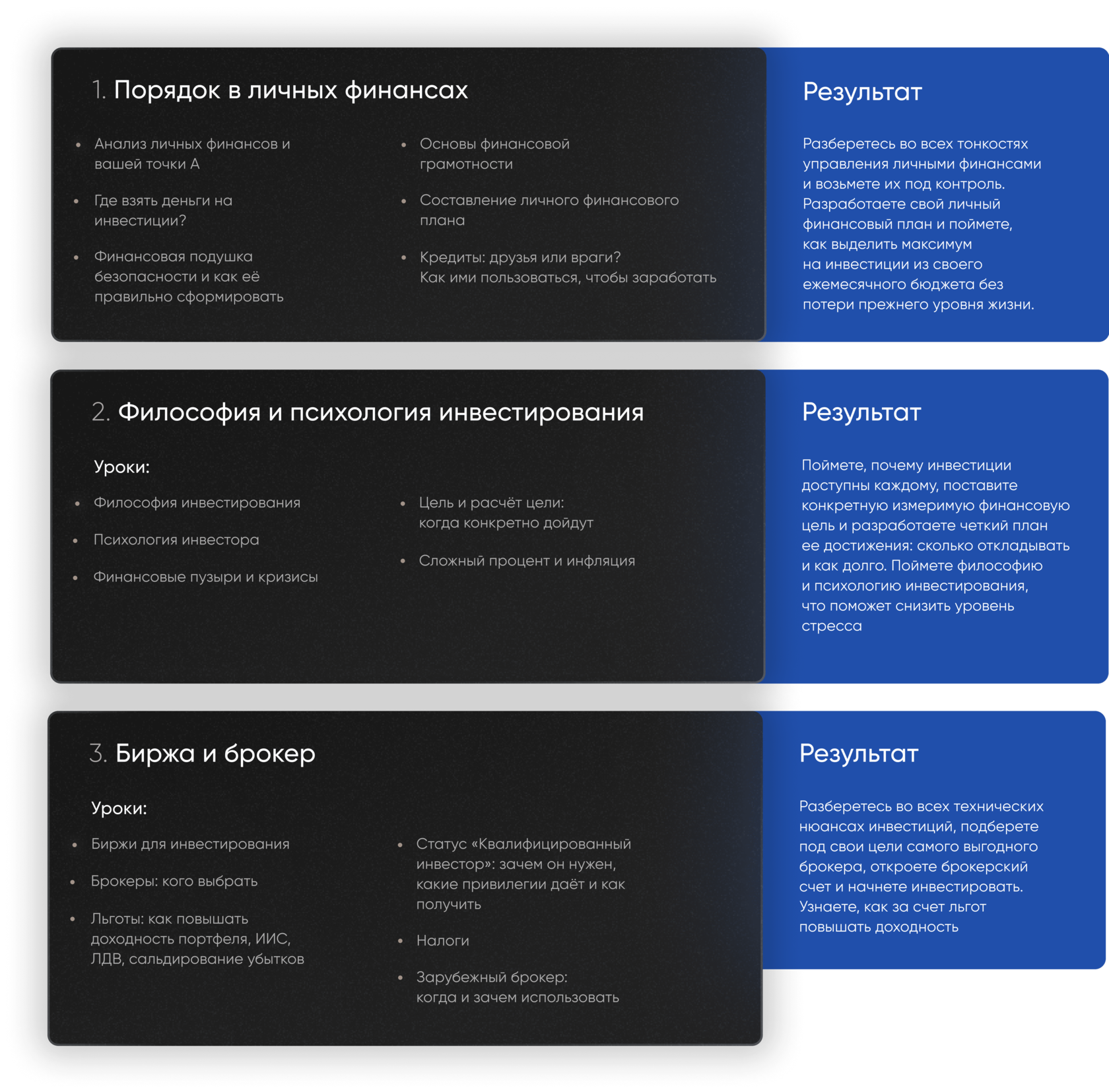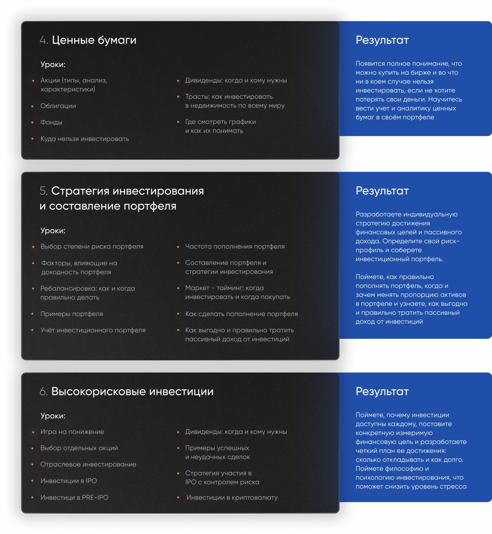 На обучение у вас будет уходить не больше 3-4 часов в неделю. В начале обучения придется тратить чуть больше часа на само инвестирование. Но под конец курса у вас будет все необходимое, чтобы тратить на инвестирование 1 час в месяц.