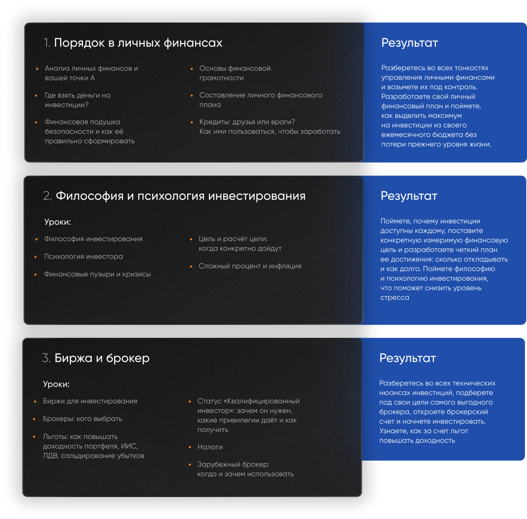 На обучение у вас будет уходить не больше 3-4 часов в неделю. В начале обучения придется тратить чуть больше часа на само инвестирование. Но под конец курса у вас будет все необходимое, чтобы тратить на инвестирование 1 час в месяц.